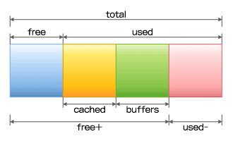 Buffers와 Cached는 Page Cache이고, 정확하게는 Buffers는 Cached에 SwapCached를 추가한 것이 Page Cache의 Total이지만, free command에서는 SwapCached가 표현되지 않죠. 그림을 보면, Buffers와 Cached를 합친 것을 used에서 뺀(used-), free를 더한 (free+)로 보다 현실적인 Physical Memory size와 이용가능한 Physical Memory size를 출력하고 있죠. 따라서, 이 두 수치를 참고하면 됩니다.