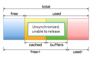 그렇다고 해서, System이 이용가능한 Memory size를 파악하기엔 부족하죠. 앞에서, Page Cache를 다른 용도로 재이용하기에는 “Storage와 Sync하고 있음”이라는 조건이 있었죠. Buffers와 cached에는 당연히 “Storage와 Unsynchronized” Page Cache가 포함되어 있죠. 그래서, free+는 실제 이용가능한 Memory size보다 좀 더 부풀려져 있게 되고, 아래와 같이 표현 가능하죠.